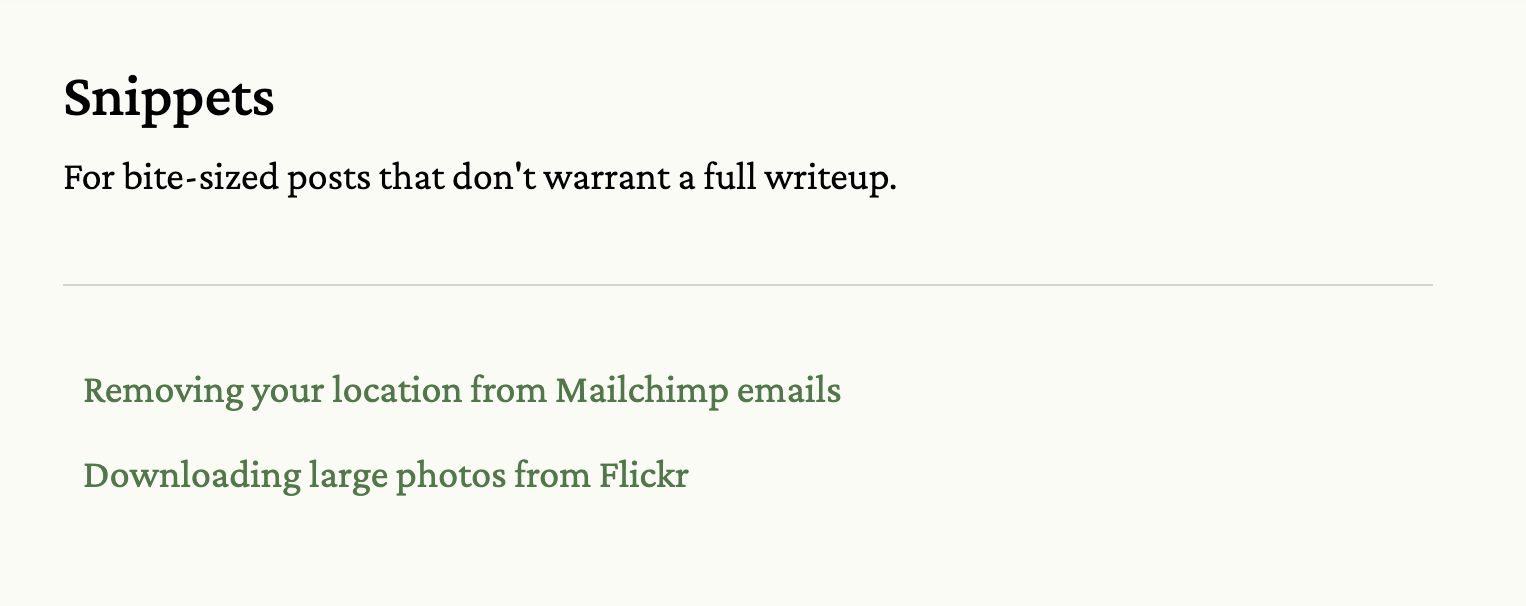 I love asides. Likewise there are a lot of small things I come across that either aren't meaty enough for a full post, or trend so narrowly technical that I feel hesitant about broadcasting (a reticence my college self did not share, just look at my post around setting up my router). I still want them to be searchable as a reference for myself and potentially others, but I want them to take up less presence on the blog (and not be sent out in email blasts). The solution? Snippets!