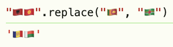 The flags lead to one of my favorite JS behavior, where inane strings like replacing the emoji flag of Sri Lanka with Dominica in Albania-Kyrgyzstan helpfully yields Andorra-Madagascar (because swapping LK for DM in AL KG becomes AD MG.