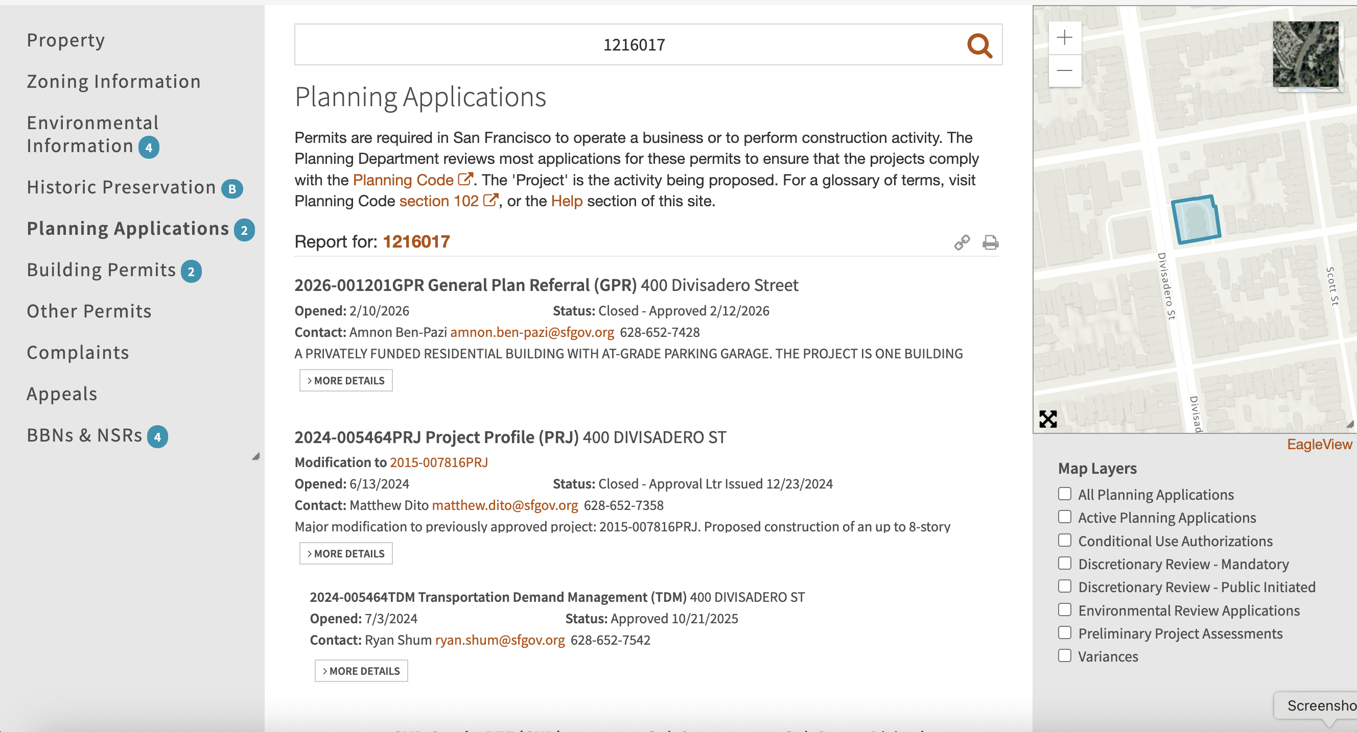 The documents in question I'm looking for are accessible at https://sfplanninggis.org/pim/?tab=Planning+Applications&search=1216017, where 1216017 is the key lot identifier: Block 1216, Lot 017.
