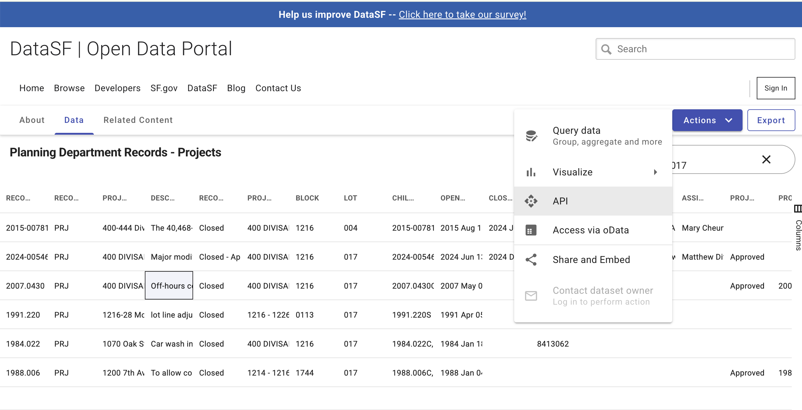 ). While I found the 1:1 mappings between the PIM layers and the datasets a little opaque, I managed to track down the Planning Department Records's two relevant datasets, "Projects" and "Non-Projects".