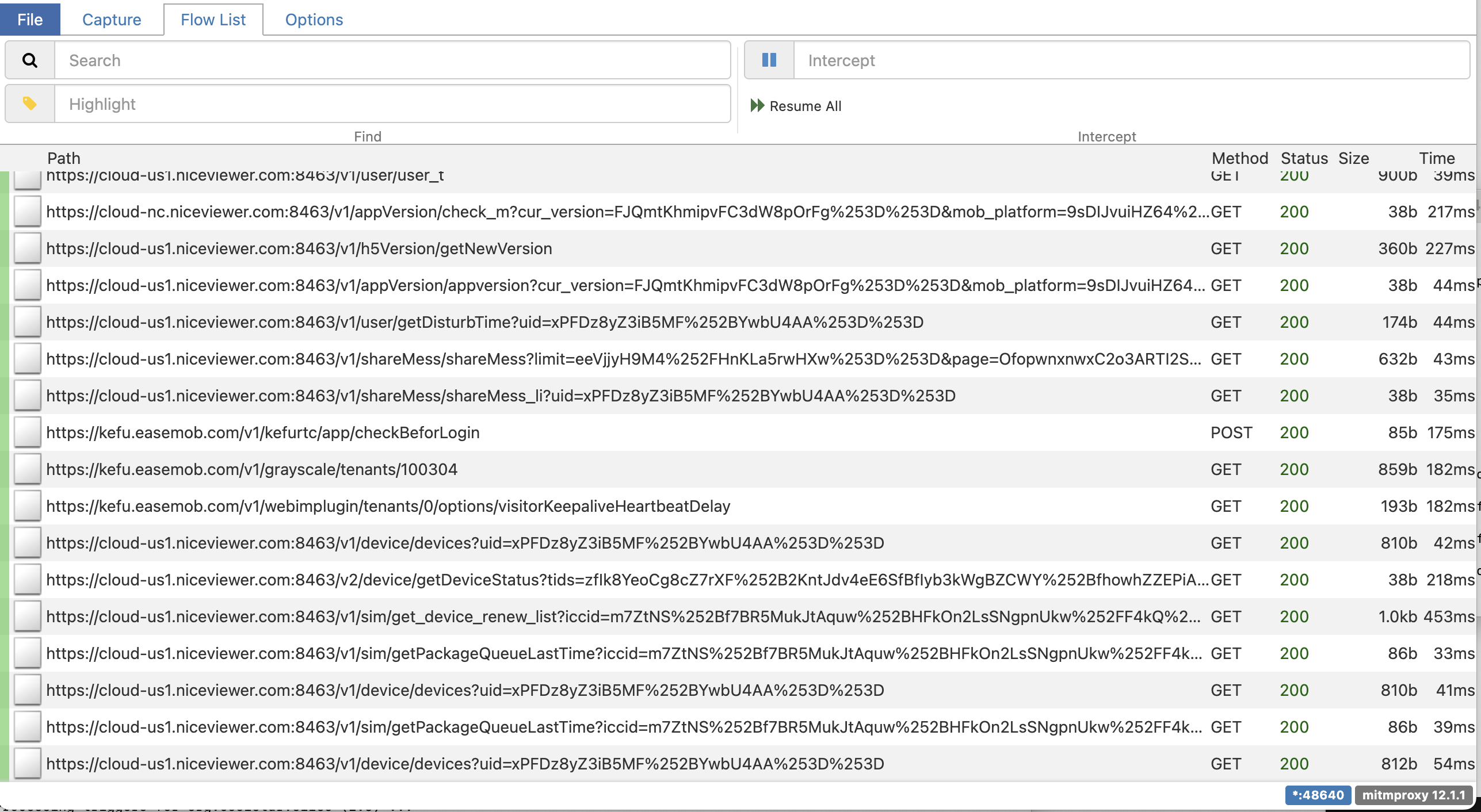 that the phone looks up through that proxy, and we can see what it's querying and what it's getting back. As a reminder I'm looking for a clear request to some camera service that I can repurpose into a broadcast. Unfortunately that wasn't the case: while I got requests to https://cloud-us1.niceviewer.com:8463/v1/device/devices and https://cloud-us1.niceviewer.com:8463/v2/device/getDeviceStatus they were just information about which cams I could see.