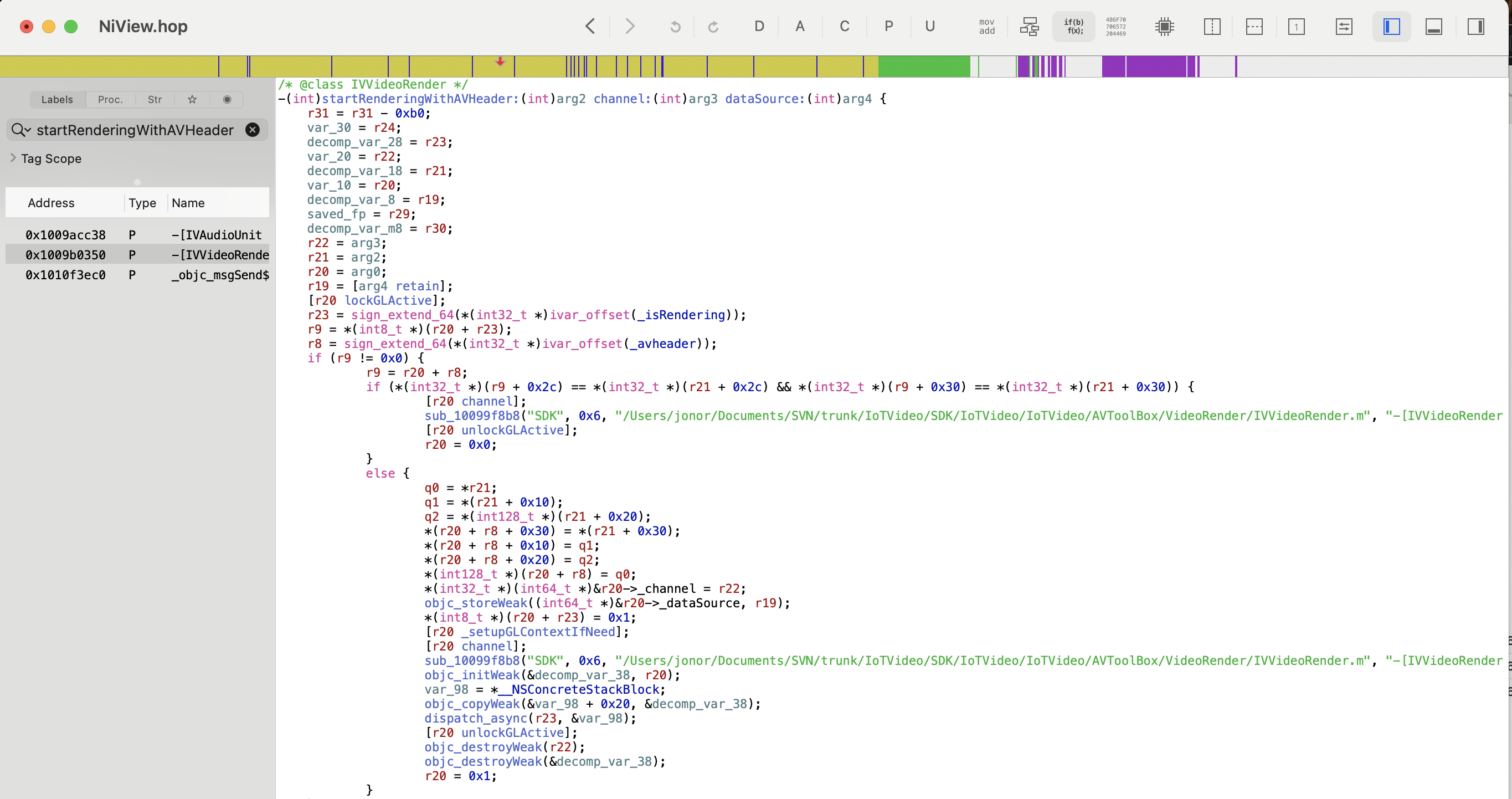 From another Terminal window on my laptop I can run lldb and process connect connect://192.168.0.247:1234 to attach to that running instance. Navigating to the camera feeds and running process interrupt and po [[UIWindow keyWindow] recursiveDescription] give a pretty good sense of the UI layout as well. In particular NVLivePlayerView and IVVideoRender feel like the best candidates.