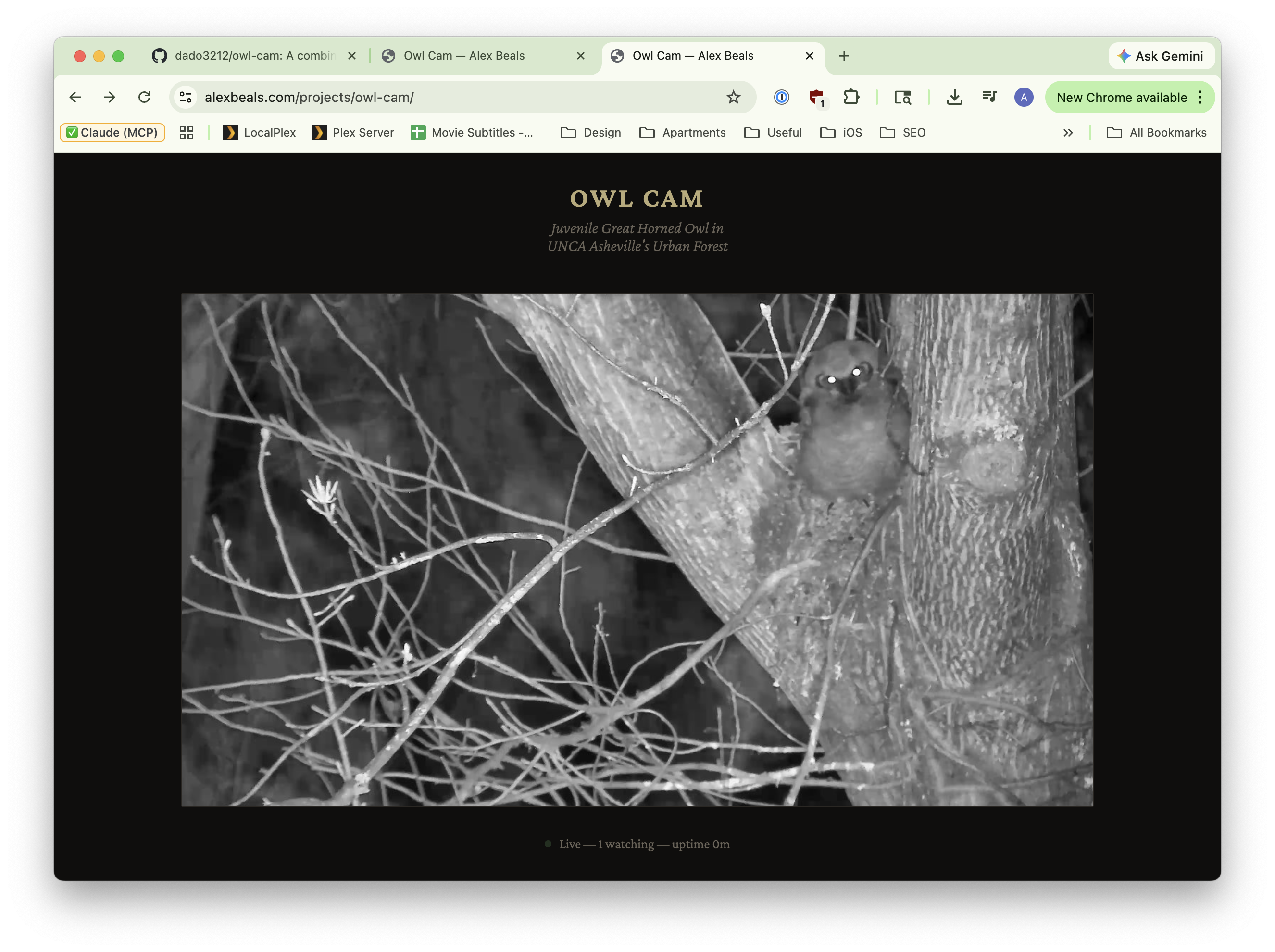and more recently leading birding sessions to show off a Great Horned Owl family and their three owlets. Spencer set up a 24/7 camera filming their nest but wanted to livestream that footage and couldn't figure out how — enter me, stage right! While it wasn't easy